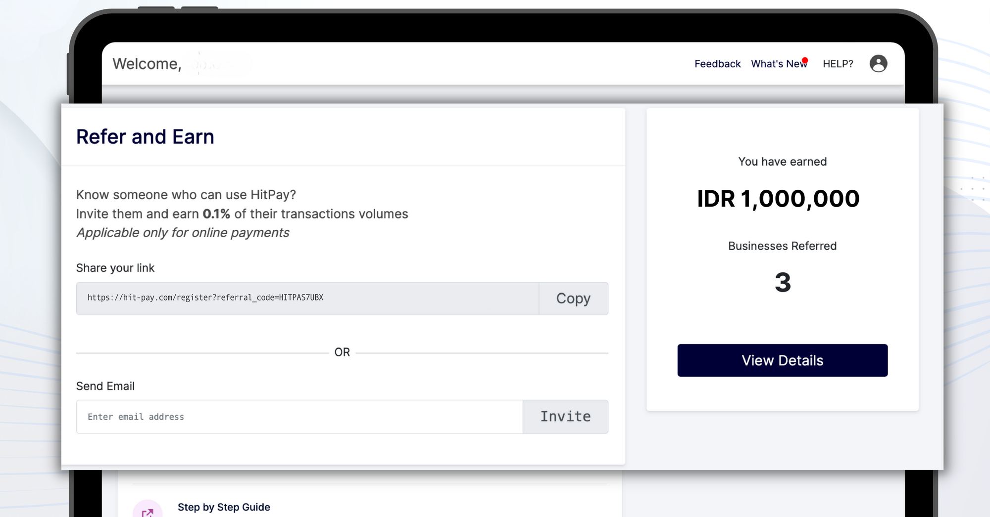 Program afiliasi HitPay memungkinkan Anda mendapatkan komisi sebesar 0,1% dari tiap transaksi yang sukses dilakukan oleh pengguna baru yang Anda ajak bergabung.