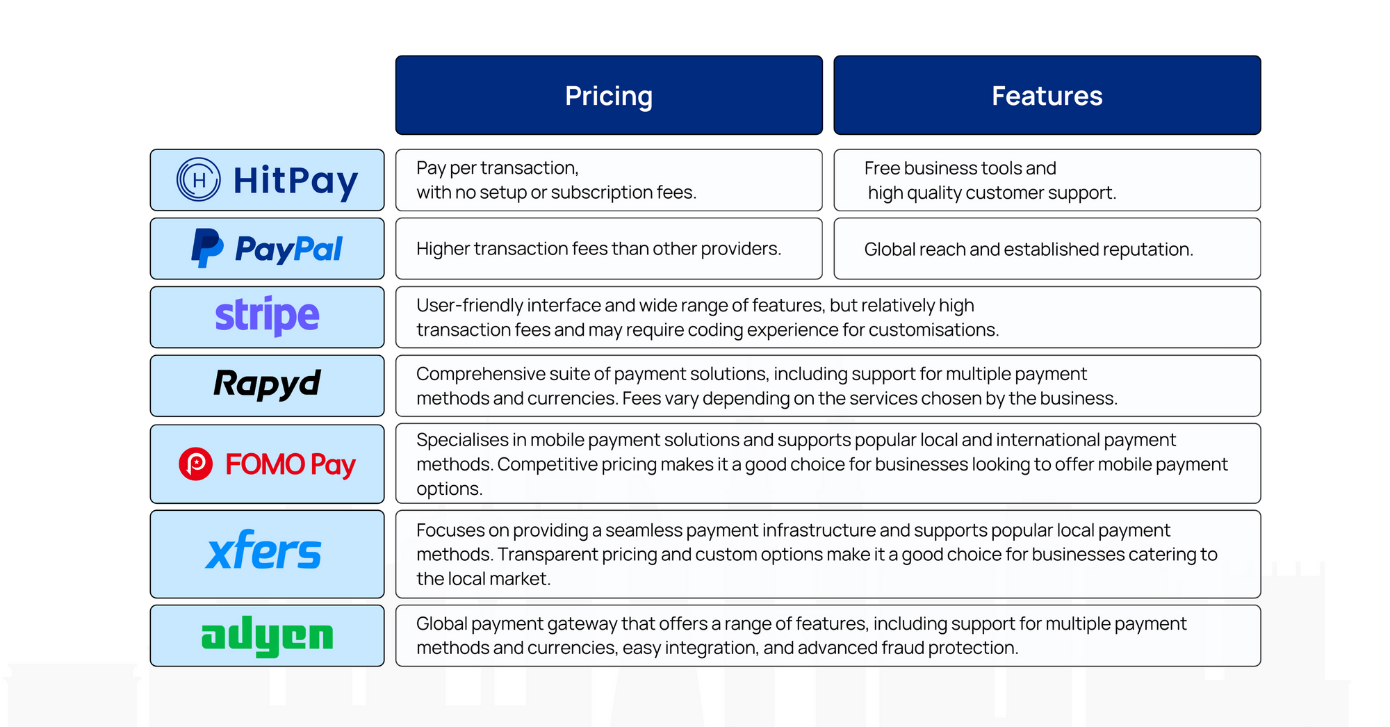 - FOMO Pay: Specialises in mobile payment solutions and supports popular local and international payment methods. Competitive pricing makes it a good choice for businesses looking to offer mobile payment options.