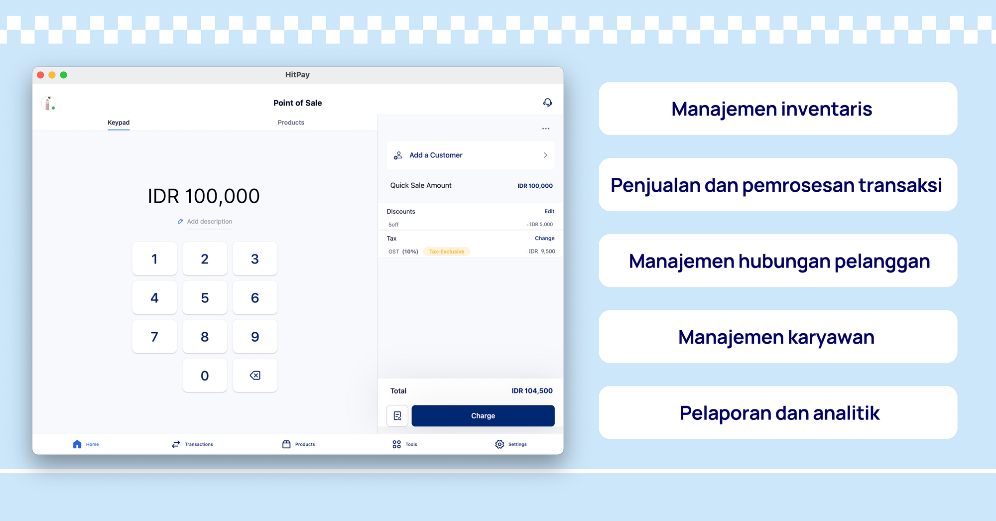 Jika Anda sedang mempertimbangkan sistem POS terbaik yang cocok untuk bisnis Anda, mungkin HitPay POS adalah pilihan yang paling tepat. Karena, HitPay hadir sebagai solusi pembayaran terlengkap yang secara khusus dirancang untuk memenuhi kebutuhan UMKM di Indonesia. Platform ini menyediakan solusi sistem POS yang komprehensif dan mudah digunakan, bertujuan untuk mempermudah proses transaksi dan manajemen inventaris. Dengan harga yang bersaing dan alat tanpa kode, HitPay menjadi pilihan yang ideal bagi UMKM di Indonesia yang mencari sistem POS yang handal dan efisien.