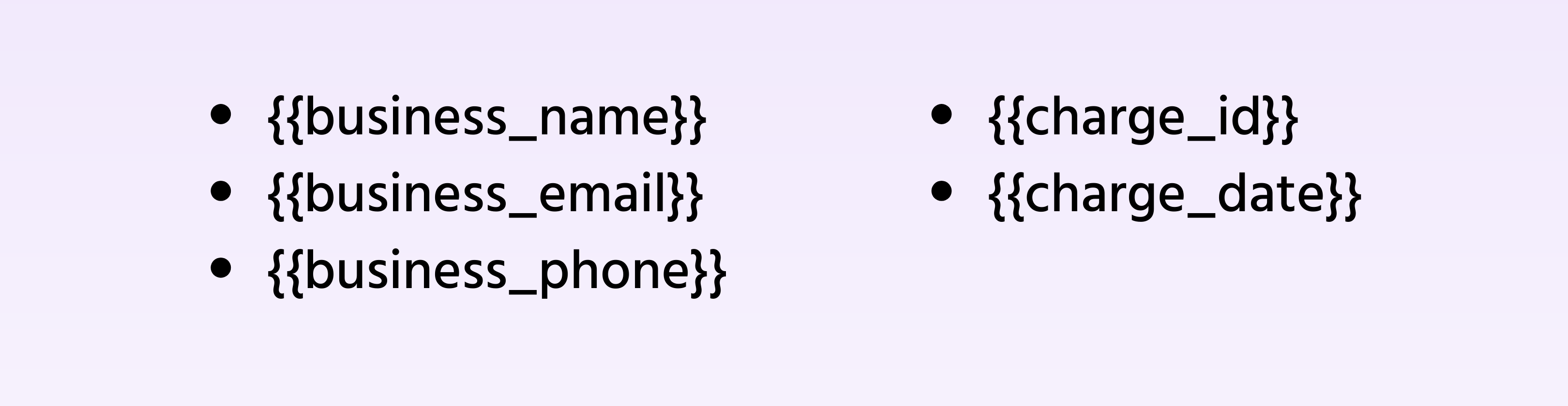To use a variable, simply copy and paste the variable (e.g. {{business_name}}) into your email text. You can find the available variables at the bottom of the page: