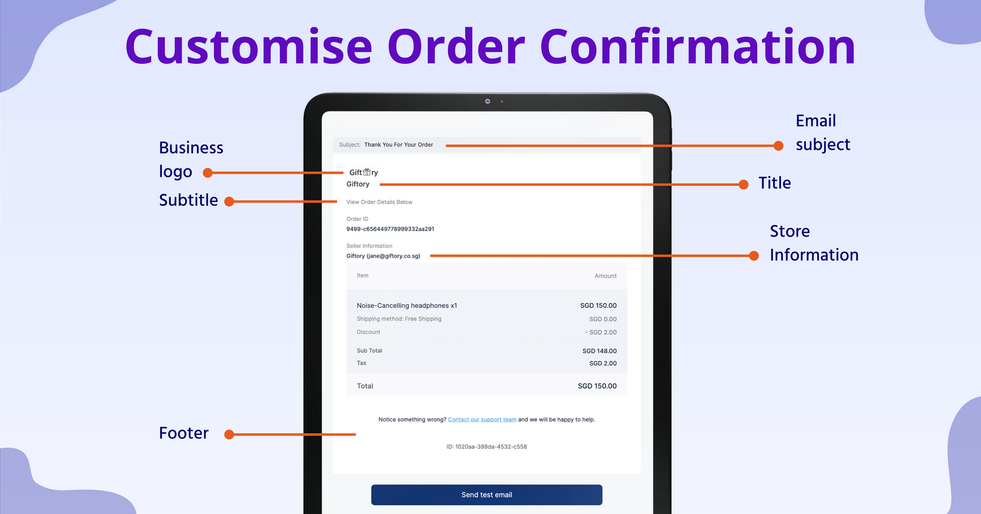 You can customise: Business logo, Email subject, Title, Subtitle, Footer, and Store information