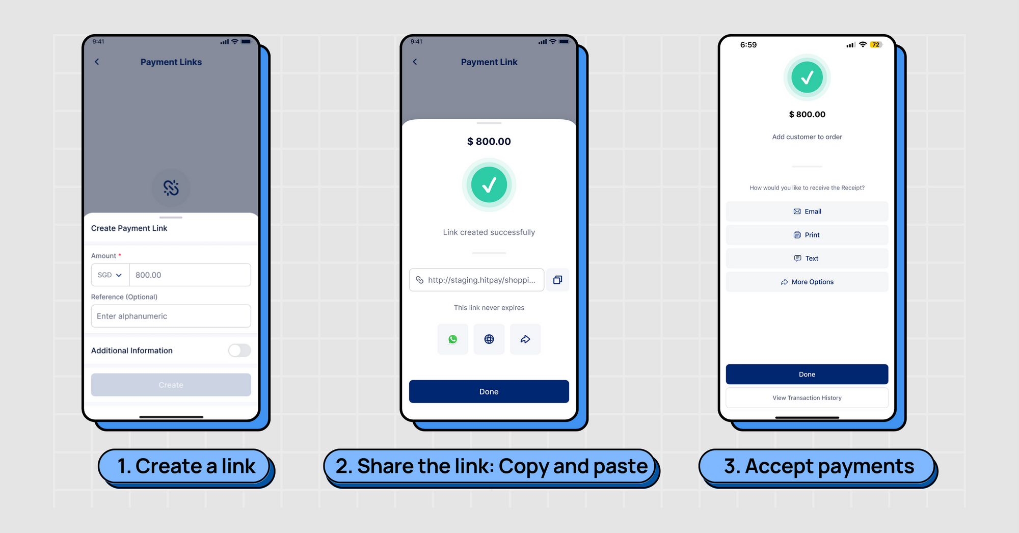 First, sign up for a HitPay account, and then follow the guided steps to generate your payment link.