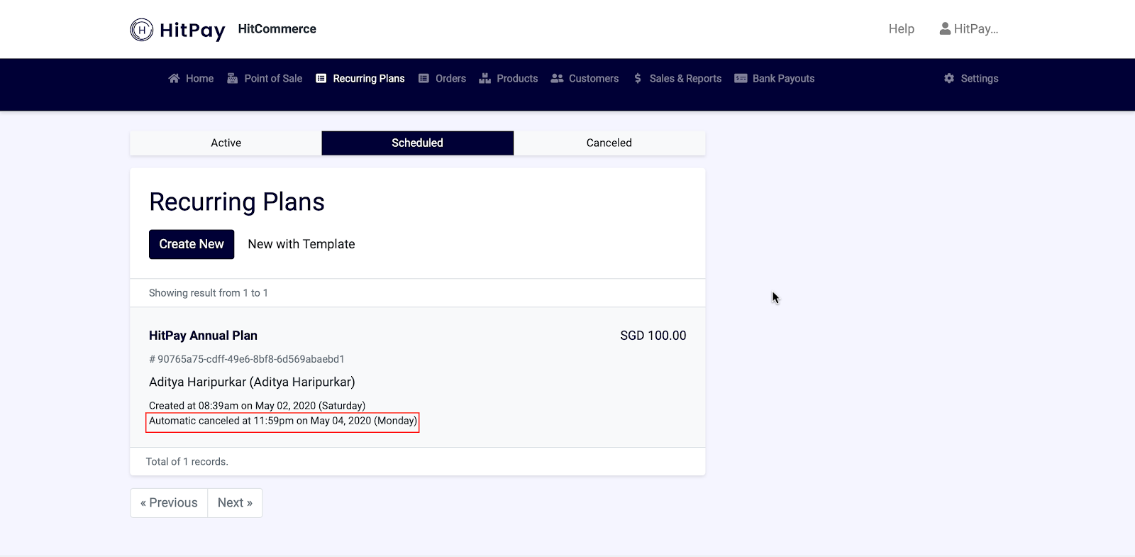 Step 1: Log in to your HitPay Dashboard. Select Recurring Plans and click on Create New.