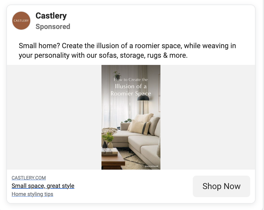 For example, this ad from the furniture e-commerce store Castlery showed up while browsing Facebook after a recent purchase on their e-commerce store.
