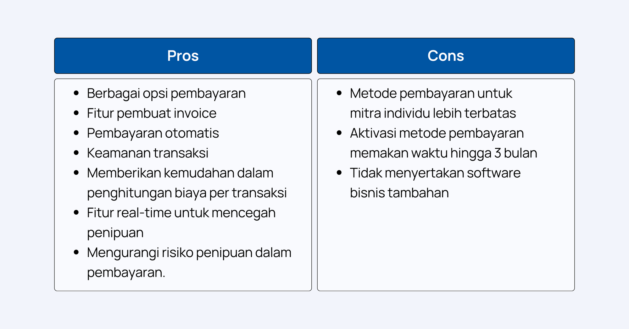 Meskipun Xendit populer di kalangan bisnis besar, beberapa kekurangan perlu diperhatikan. Metode pembayaran untuk mitra individu lebih terbatas, aktivasi metode pembayaran tertentu memakan waktu hingga 3 bulan, dan tidak menyertakan software bisnis tambahan. Bagi yang membutuhkan manajemen inventaris dan toko e-commerce, platform lain diperlukan.