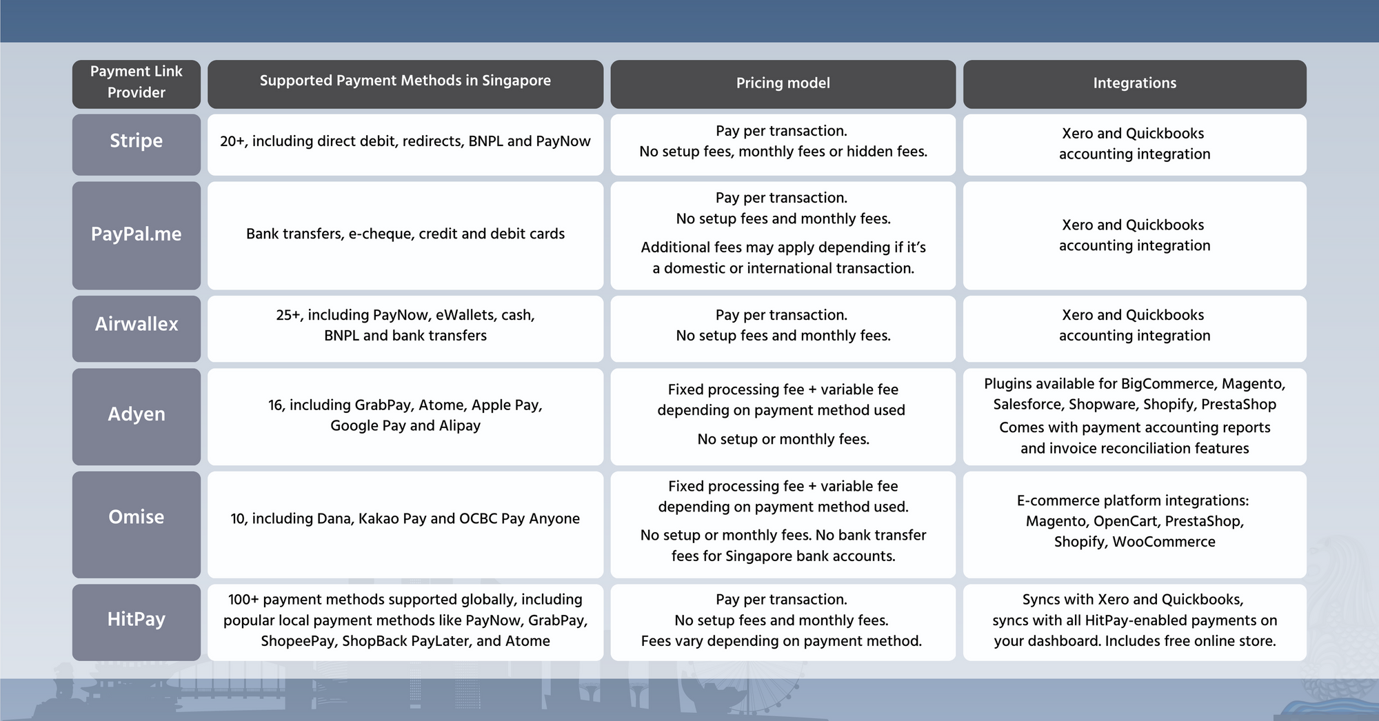 We compare 6 popular payment link software solutions — Stripe, Airwallex, Adyen, Omise, HitPay, and PayPal.me — and assess how their payment link solutions measure up for a small business in Singapore. Read on!