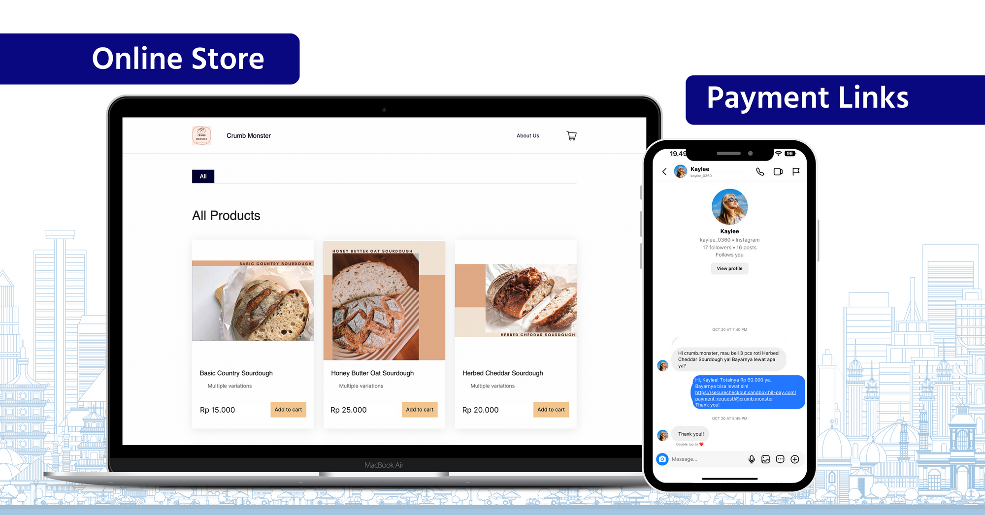 - Link pembayaran: Menerima pembayaran secara online melalui media sosial, e-mail atau aplikasi chatting dengan memberikan link pembayaran.