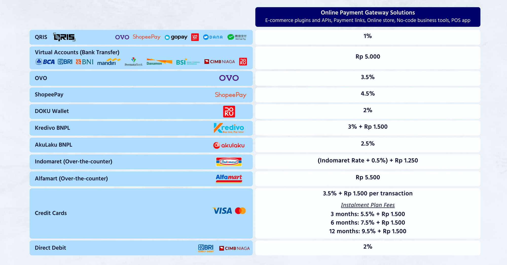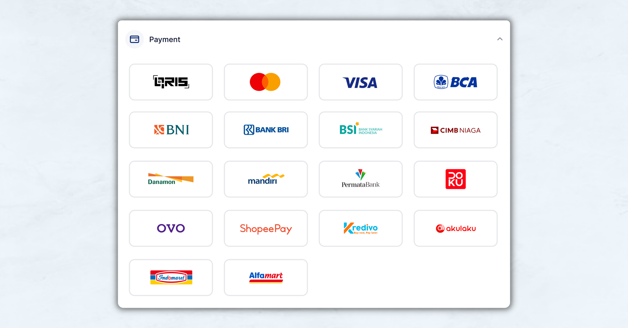 Jika Anda ingin menawarkan beberapa metode pembayaran, pastikan Anda memilih yang paling cocok untuk operasional bisnis Anda. Bisa jadi Anda hanya perlu menerima pembayaran dengan virtual account dan kartu debit/kredit atau fokus hanya pada QRIS dan BNPL.