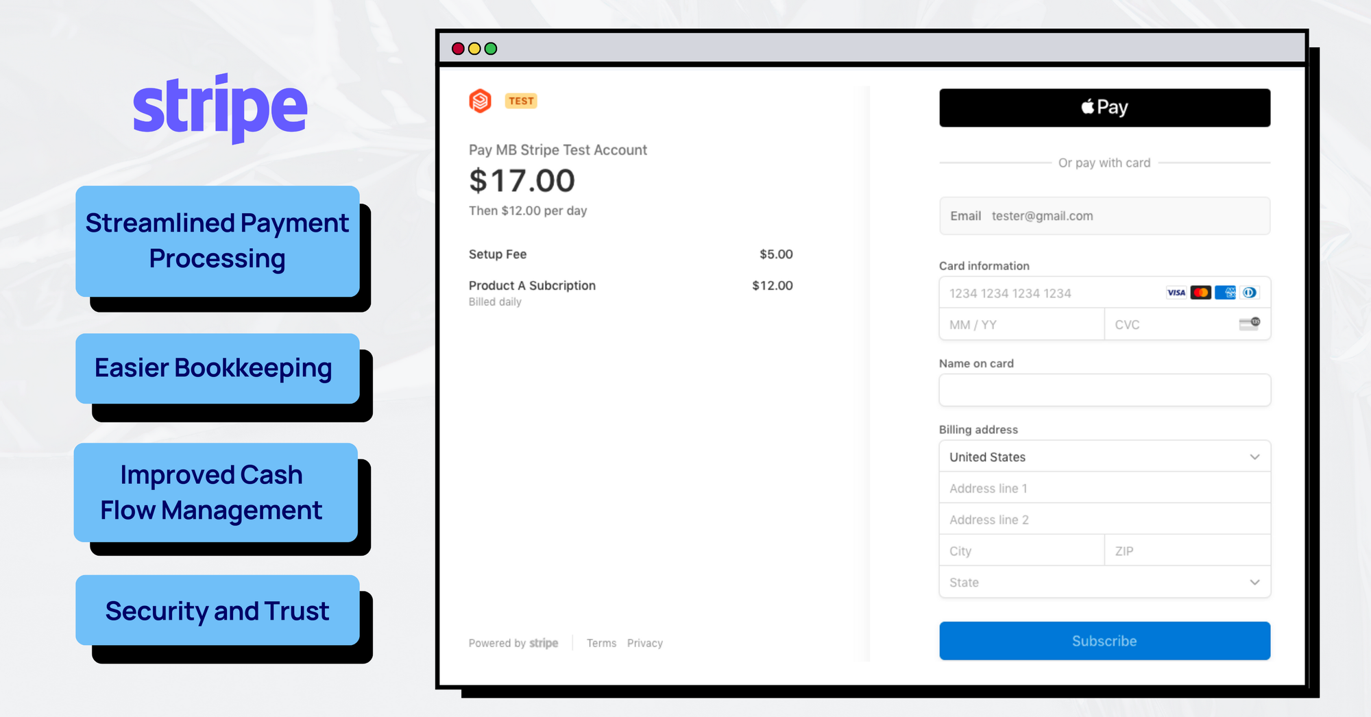 Stripe Payments provides features like automated recurring billing and subscription management, ensuring timely and predictable cash flows. By controlling payment schedules, SMEs can better manage their finances, pay suppliers on time, and invest in business growth.